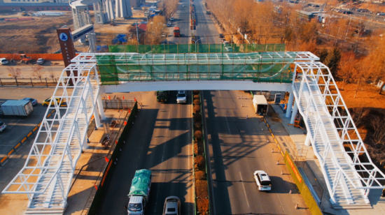 據(jù)悉,本項目天橋總體采用“匚”字型布局,主體結(jié)構(gòu)上跨黑大公路。主橋設(shè)計全長38米,全寬4米。橋梁上部結(jié)構(gòu)采用單箱單室鋼箱梁,梁高1.8米,結(jié)構(gòu)穩(wěn)固。橋梁兩側(cè)各布置1道人行梯道,梯道寬度為4米,單個梯道長度約18.05米,便于行人上下。