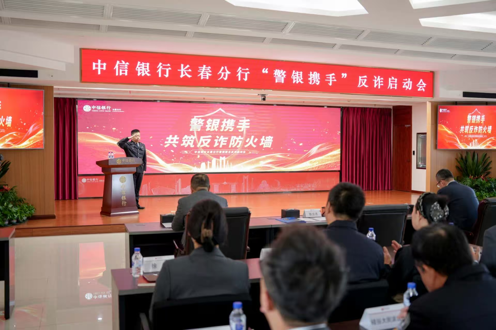 10月23日上午9時,中信銀行長春分行與長春市公安局刑偵支隊聯(lián)合舉行“警銀攜手,共筑反詐防火墻”啟動會開啟儀式。市局刑偵支隊有關(guān)領(lǐng)導(dǎo)及反電信網(wǎng)絡(luò)詐騙中心專家,吉林金融監(jiān)管局消保部門負(fù)責(zé)人、各區(qū)派出所民警、社區(qū)代表、老年大學(xué)相關(guān)負(fù)責(zé)人,以及中信銀行總分行相關(guān)領(lǐng)導(dǎo)和員工代表共同參會。