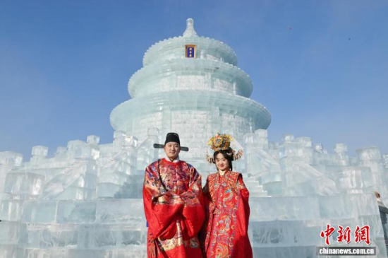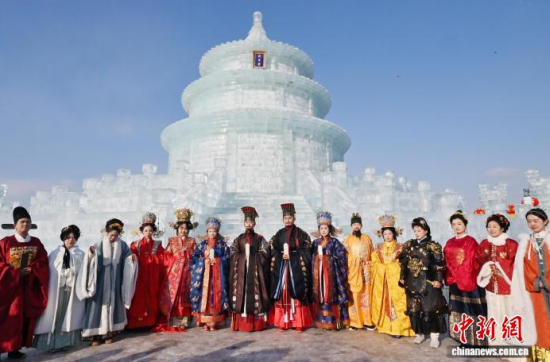 1月24日,長春市文化廣場上,眾多漢服愛好者齊聚巨型冰雕“祈年殿”前拍照留念。該冰雕以北京天壇為原型,通體晶瑩,飛檐斗拱皆現(xiàn)冰雪之韻。衣袂飄飄的漢服身影與剔透冰雕相映成趣。中新社記者 張瑤 攝
